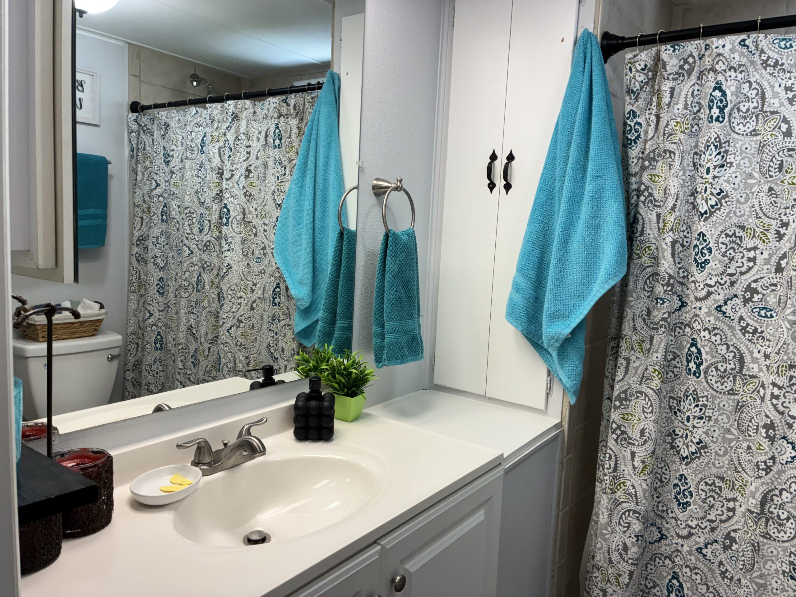 bathroom is so cute and fully remodeled with a floor-to-ceiling tiled shower! The home is cooled and
